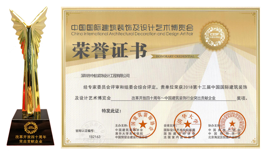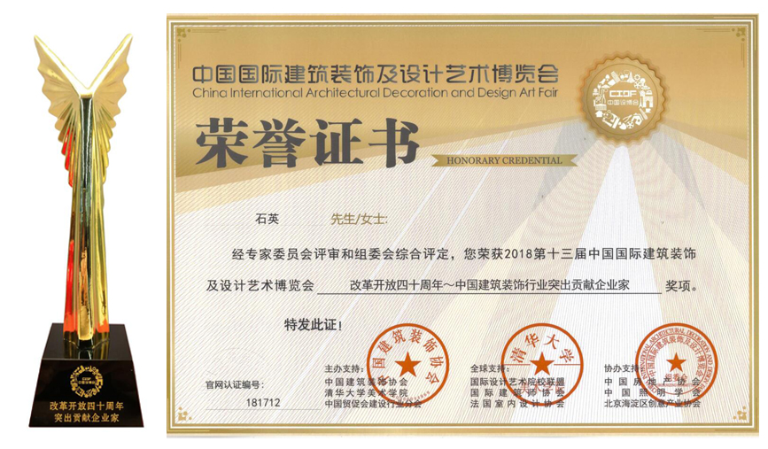 ? ? ??近日,由中國建筑裝飾協(xié)會與清華大學(xué)美術(shù)學(xué)院聯(lián)合主辦的第十三屆中國國際建筑裝飾及設(shè)計藝術(shù)博覽會在北京國際會議中心舉行,在本次博覽會上,中航裝飾被授予“改革開放四十周年~中國建筑裝飾行業(yè)突出貢獻(xiàn)企業(yè)”稱號,中航裝飾集團石英董事長被評為“改革開放四十周年~中國建筑裝飾行業(yè)突出貢獻(xiàn)企業(yè)家”。